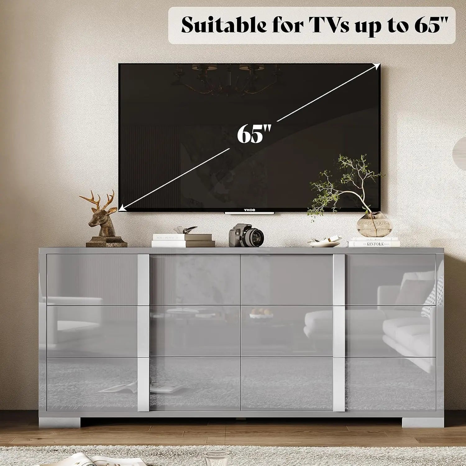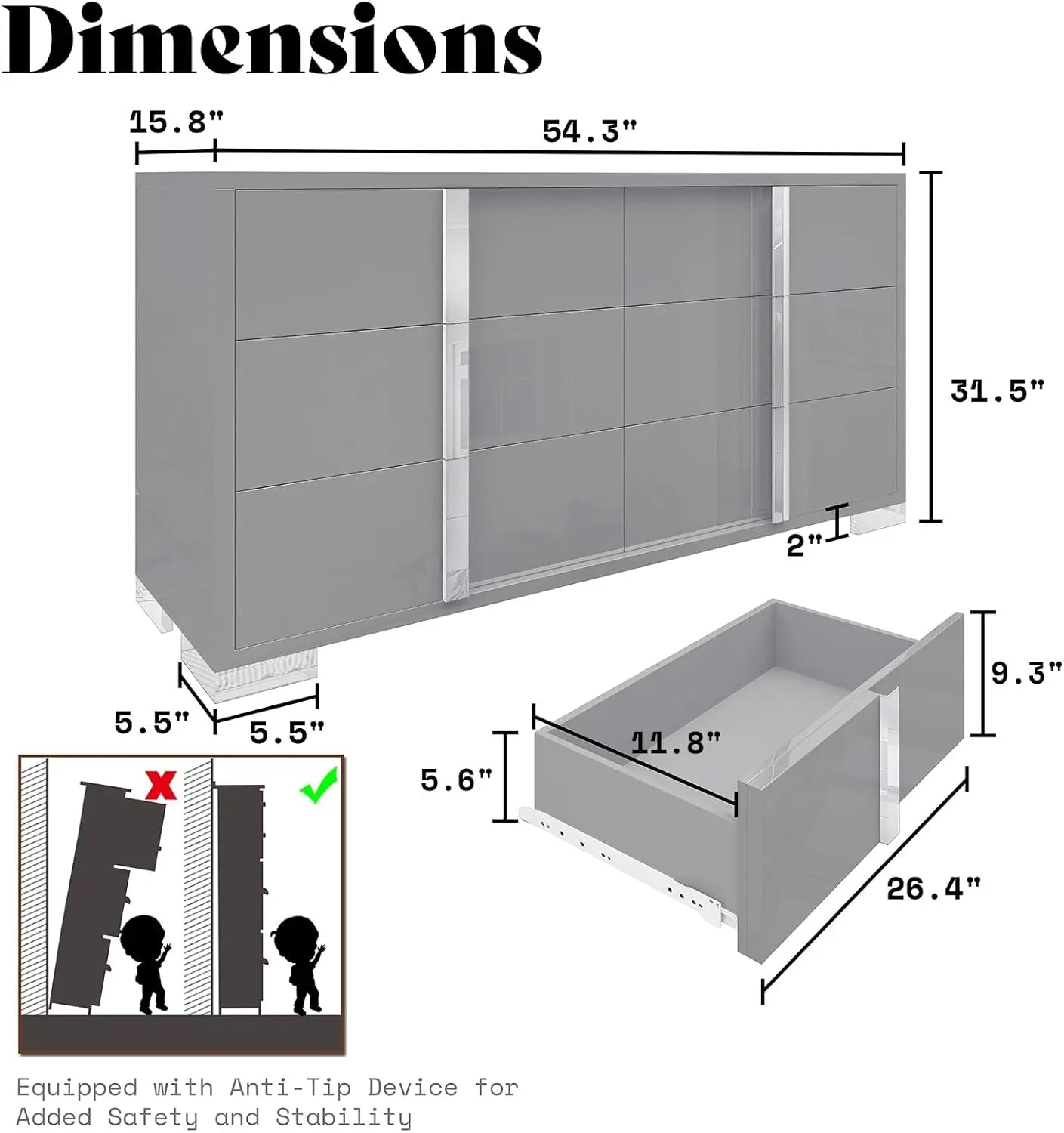 54" W High Gloss 6 Drawers Dressers with Silver Grooved Handles, Modern Storage Chest of Drawers with Wide Tabletop, for Bedroom/Dressing Room/Living Room, Grey