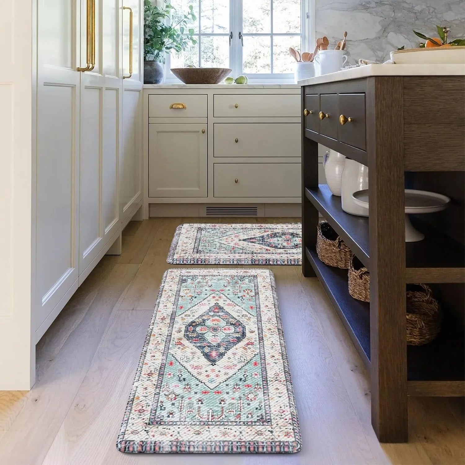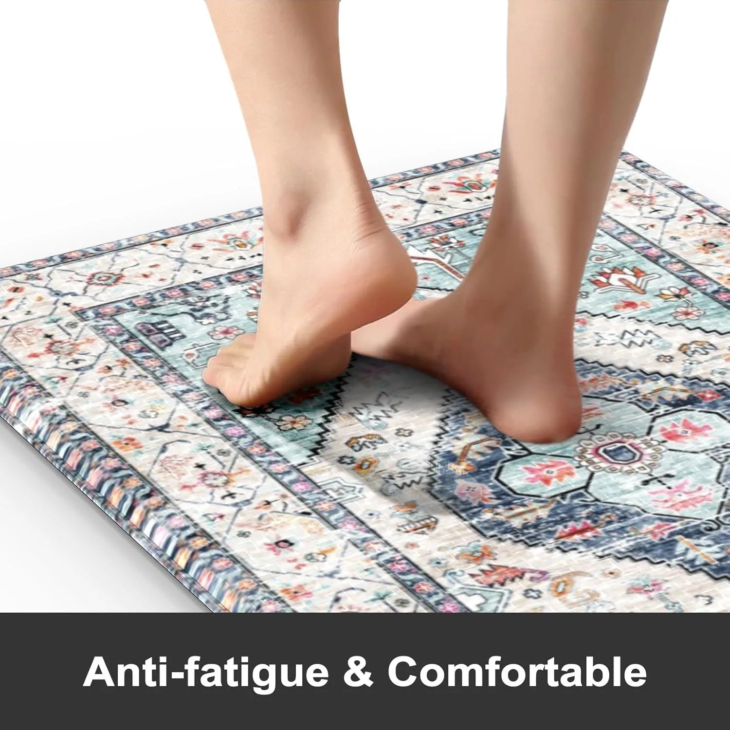 - Versatile: Vintage farmhouse style kitchen rug design features a central medallion and floral motifs in the style of Oriental rugs,easily to match your kitchen decor,bright your home.Soft thick foam provides ample support for standing in kitchen sink,laundry room, office,bathroom,dinning room,or any other high-traffic area