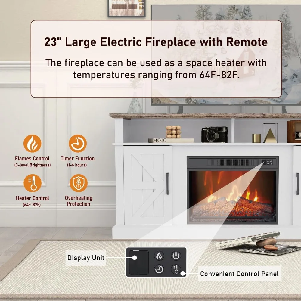 - 【23" Electric Fireplace】: The TV Stand's electric fireplace offers adjustable heat from 64 to 82 degrees Fahrenheit.Heater up a large room and keep longer warm. Electric Fireplace boasts a realistic flame effect and lifelike logs, creating an inviting ambiance. The included mobile remote control allows you to effortlessly adjust flame intensity, switch settings, and control the fireplace from the comfort of your seat.