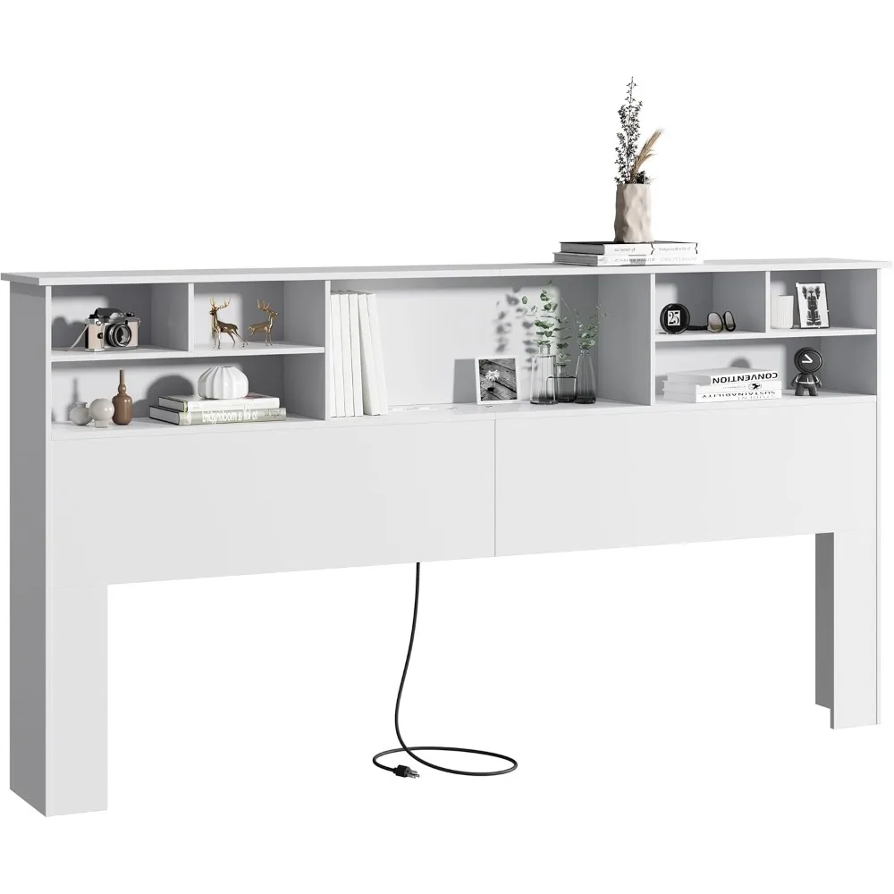 King Size Headboard for Bedroom, Stylish Bookcase Headboard with Built-in Charging Station & 2 LED Lights, Engineered Wood Headb