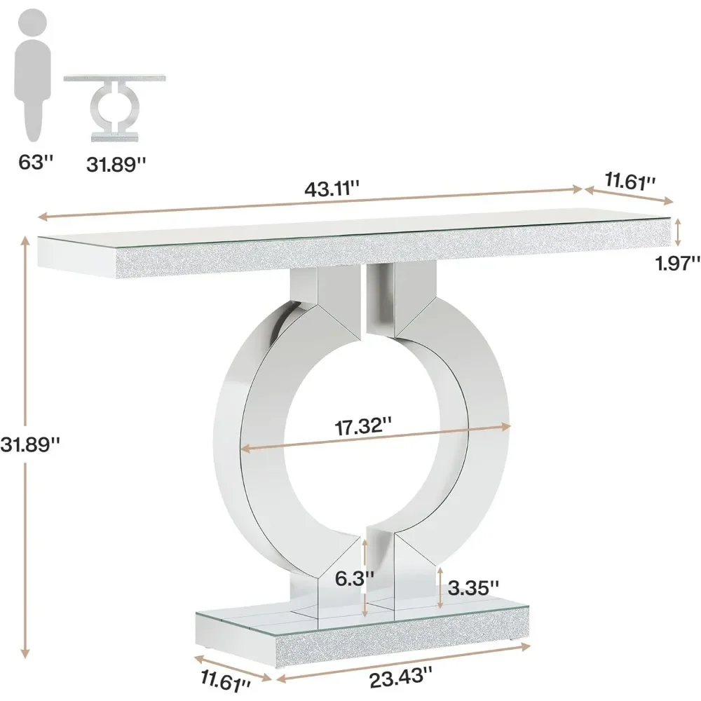 【Contemporary Mirror Design】: Our console table shines with a pristine mirrored finish and a unique O-shaped base, infusing an immediate dash of modern elegance into any space. Its design not only augments brightness and feeling of expansiveness, but also complements various décor styles, right from minimalist to lavish. The gleaming acrylic diamond veneer on its surfaces further raises its alluring appeal. (The console table mirrors include surfaces made of glass and surfaces made of acrylic material.) 【Adaptable Functionality】: This streamlined rectangular piece makes for a perfect centerpiece in your living room or entryway. Its mirrored surface helps diffuse light adding further allure when placed strategically, say, behind a sofa or in a hallway. It also seamlessly integrates into bedrooms and offices, infusing a piece of modern charm wherever it is placed. 【Simple Assembly】: Armed with the provisioned screws and instructions, this table assembly becomes a breeze. The assembly is so intuitive that even those inexperienced with home assembly projects can easily manage it. An anti-tip kit is also included for enhanced safety, keeping the table from tipping over. 【Stylish & Useful Space】: The generously sized tabletop offers a sophisticated area to show off lamps, vases, and picture frames. Though its sleek and compact design suits smaller areas, the table's distinct geometric design ensures it stands out irrespective of the space. 【Sturdy Construction】: The table, measuring 43.11 X 11.61 X 31.69 inches (Width X Depth X Height) with legs 3.74 inches thick, promises stability. Experience its beauty and versatility for years to come, backed by solid and reliable construction. (Tips: When the console table arrives and is installed, remember to peel off the blue protective film from both sides and the inside. This will maximize the mirror effect.)