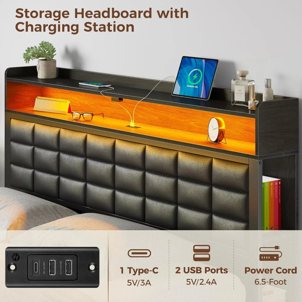 Rolanstar Full Size Bed Frame with Storage Headboard and Two Drawers Upholstered Platform Bed with Charging Station and LED Light