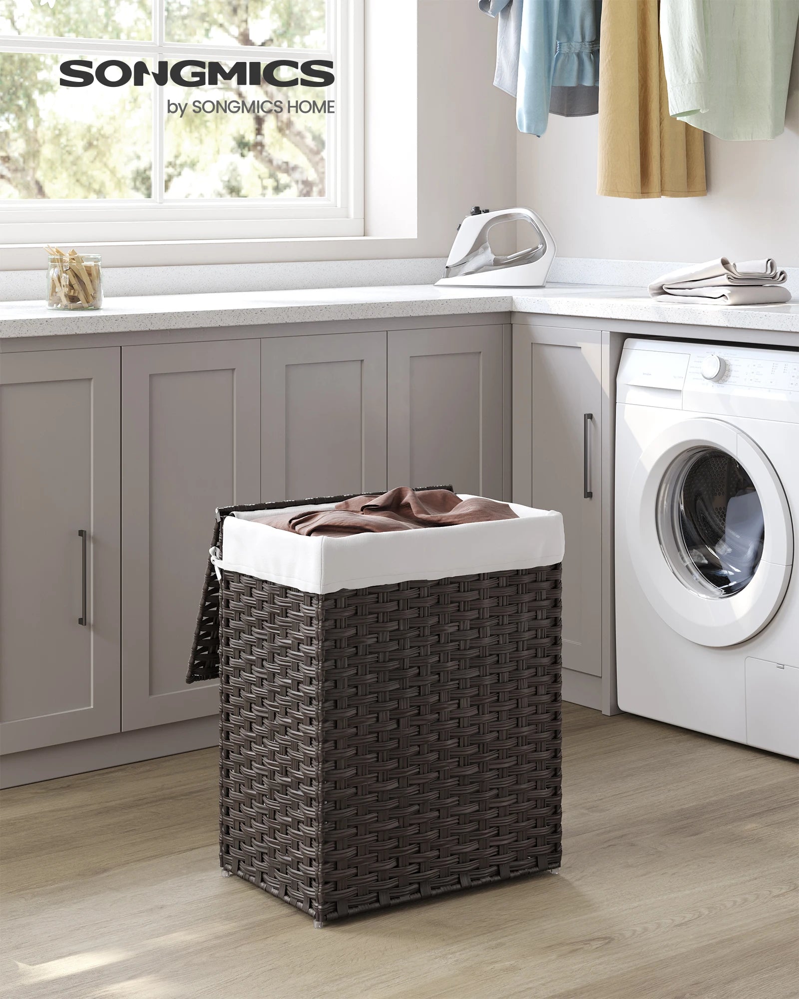 - Durable synthetic rattan weave with reinforced handles makes transport between rooms effortless and adds a timeless, modern touch to your laundry area.